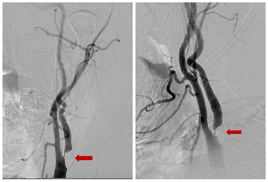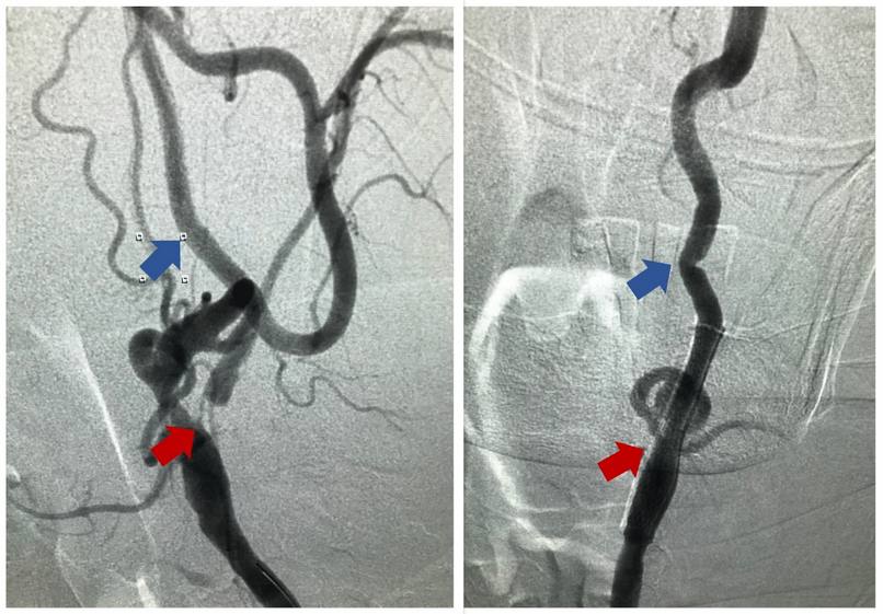 Figure 4. Carotid Stenting – Pre-procedure (left) anterior-posterior view of the left carotid artery demonstrating severe internal carotid artery (ICA) stenosis (red arrow) and normal cervical ICA (blue arrow). After placement of a carotid stent (right), there is resolution of the stenosis (red arrow) and good flow downstream (blue arrow).