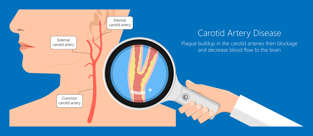 Carotid Stenosis is also called carotid disease is a narrowing of the Carotid Artery in your neck, which supplies blood to the brain. Carotid stenosis is most commonly caused by carotid atherosclerosis (buildup of plaque in the artery) or other conditions such as trauma or infection. As the narrowing increases, blood flow to the brain is reduced and blood clots can form leading to stroke.