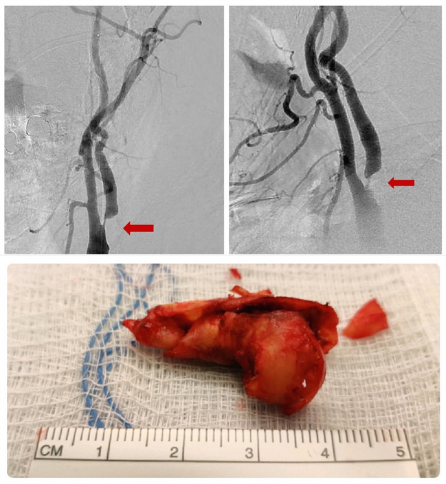 Figure 3. Carotid Endarterectomy – Cervical angiogram anterior view (upper left) and lateral view (upper right) demonstrating severe carotid stenosis (red arrows). After carotid endarterectomy reopened the vessel, an antherosclerotic plaque that was removed from the diseased vessel wall is pictured (lower image).
