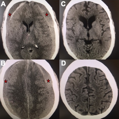 Figure 3. A, B) Axial views of a brain CT scan demonstrating chronic subdural hematomas on both sides of the brain compressing it inwards (red stars mark the hematoma). C, D) Axial views of a CT brain of the same chronic subdural hematoma 3 months after Middle Meningeal Artery Embolization demonstrating resolution of the chronic subdural collection on both sides.
