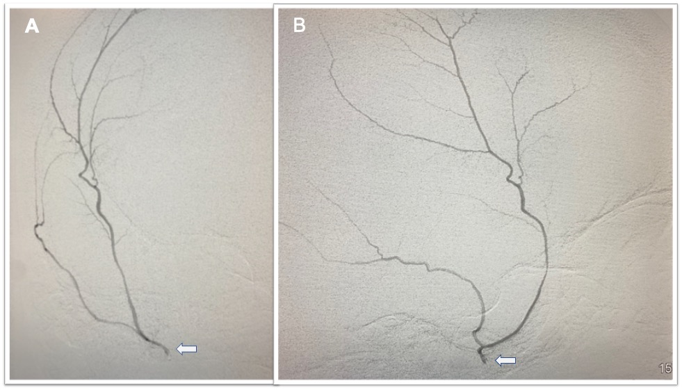 Figure 2. A) Anterior to posterior (front to back) view of the right side of the head with a microcatheter (tiny tube) in the right Middle Meningeal Artery (arrow) injecting contrast dye into the vessel which branches along the underside of the skull. B) The lateral view of the same microcatheter (arrow) injecting contrast dye filling the right Middle Meningeal Artery. This vessel was occluded to treat a chronic subdural hematoma.