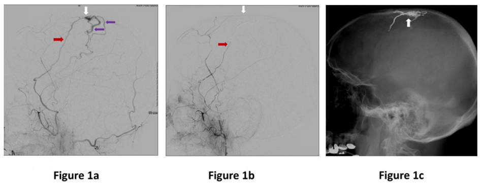 Figure 1a: Lateral (side) view of a dural artery (red arrow) abnormally connecting to a large vein on the surface on the brain (white arrow), and high pressure arterial flow is immediately filling brain veins (purple arrows). Figure 1b. Immediately after embolization where glue was injected through the artery (red arrow) into the abnormal connection (white arrow) showing no more abnormal filling of the veins. Figure 1c. Lateral (side) view skull x-ray showing the glue material filling the area abnormal connection of the fistula (white arrow).